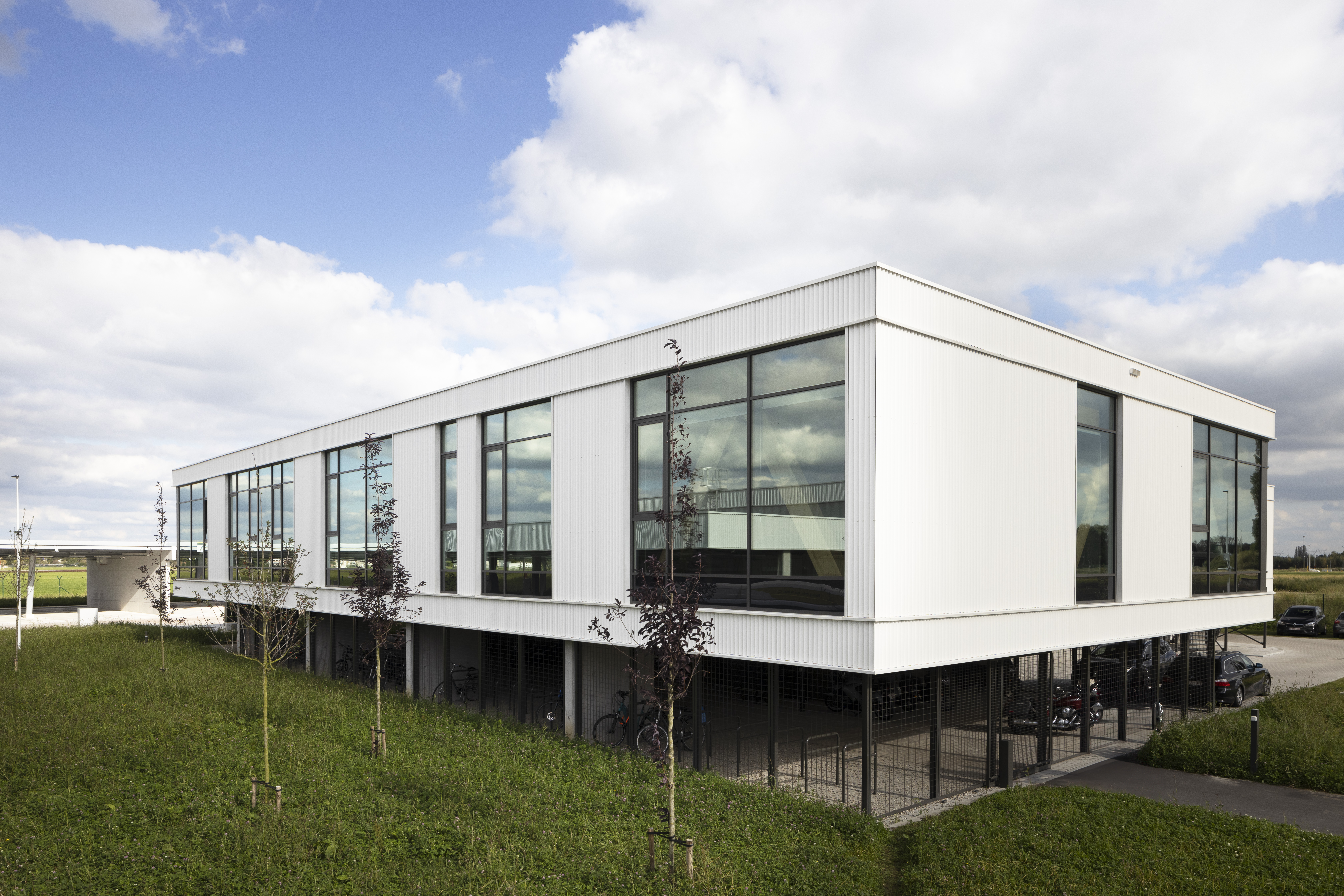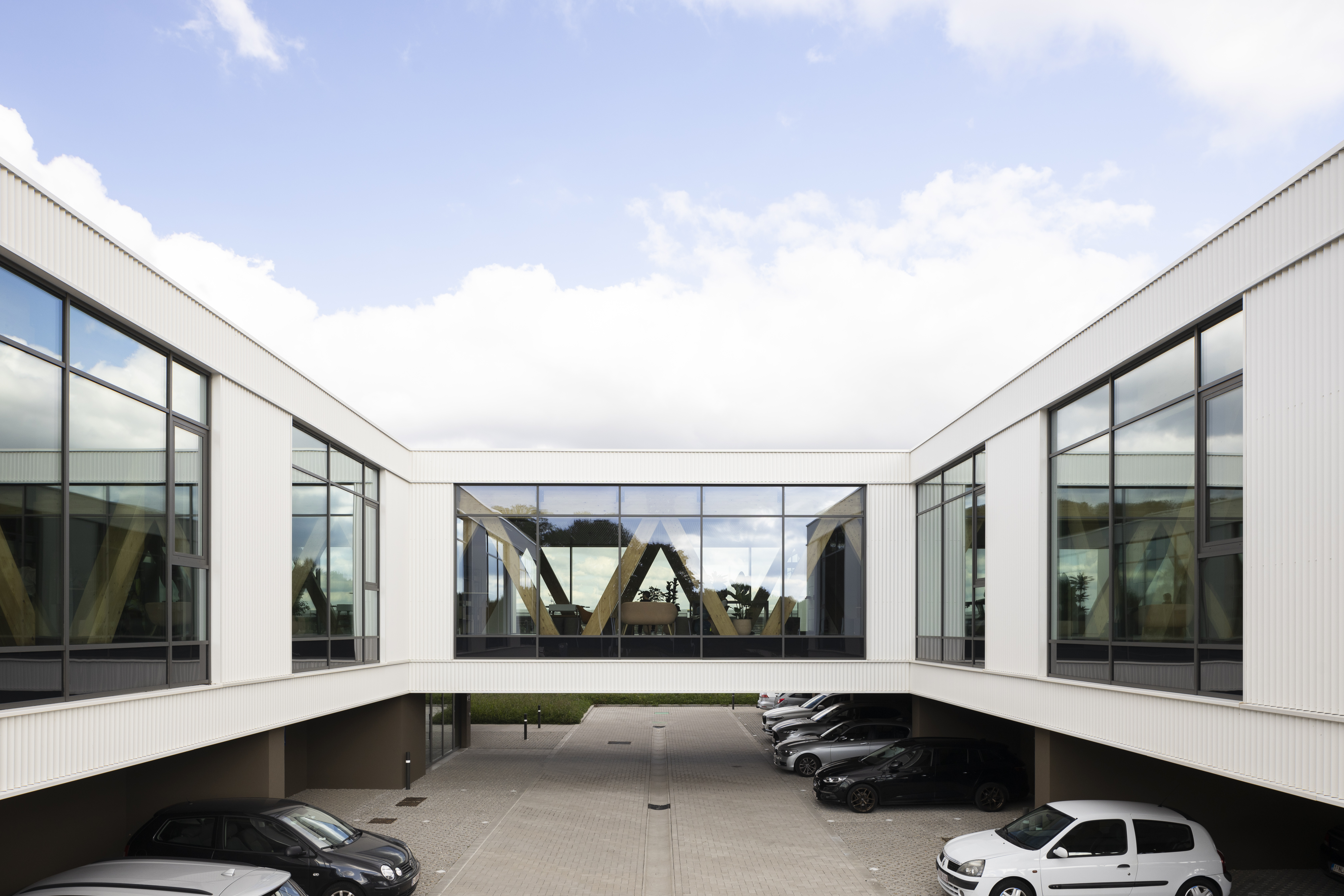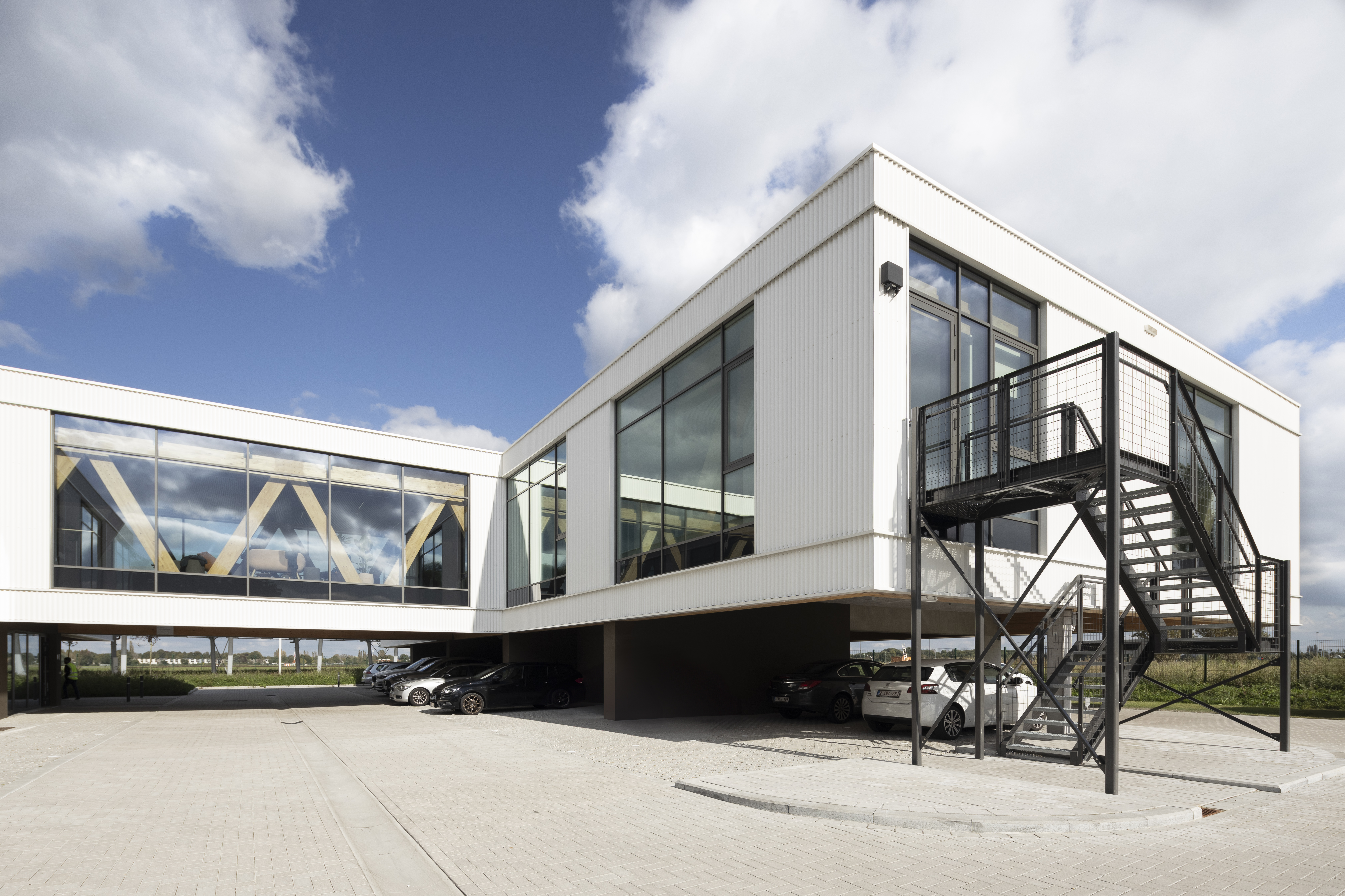 Een nieuw dienstgebouw aan de nieuwe busstelplaats van de Lijn. Dit gebouw is opgebouwd uit gelamelleerde vakwerken met telkens een overkraging van 7,5m.
