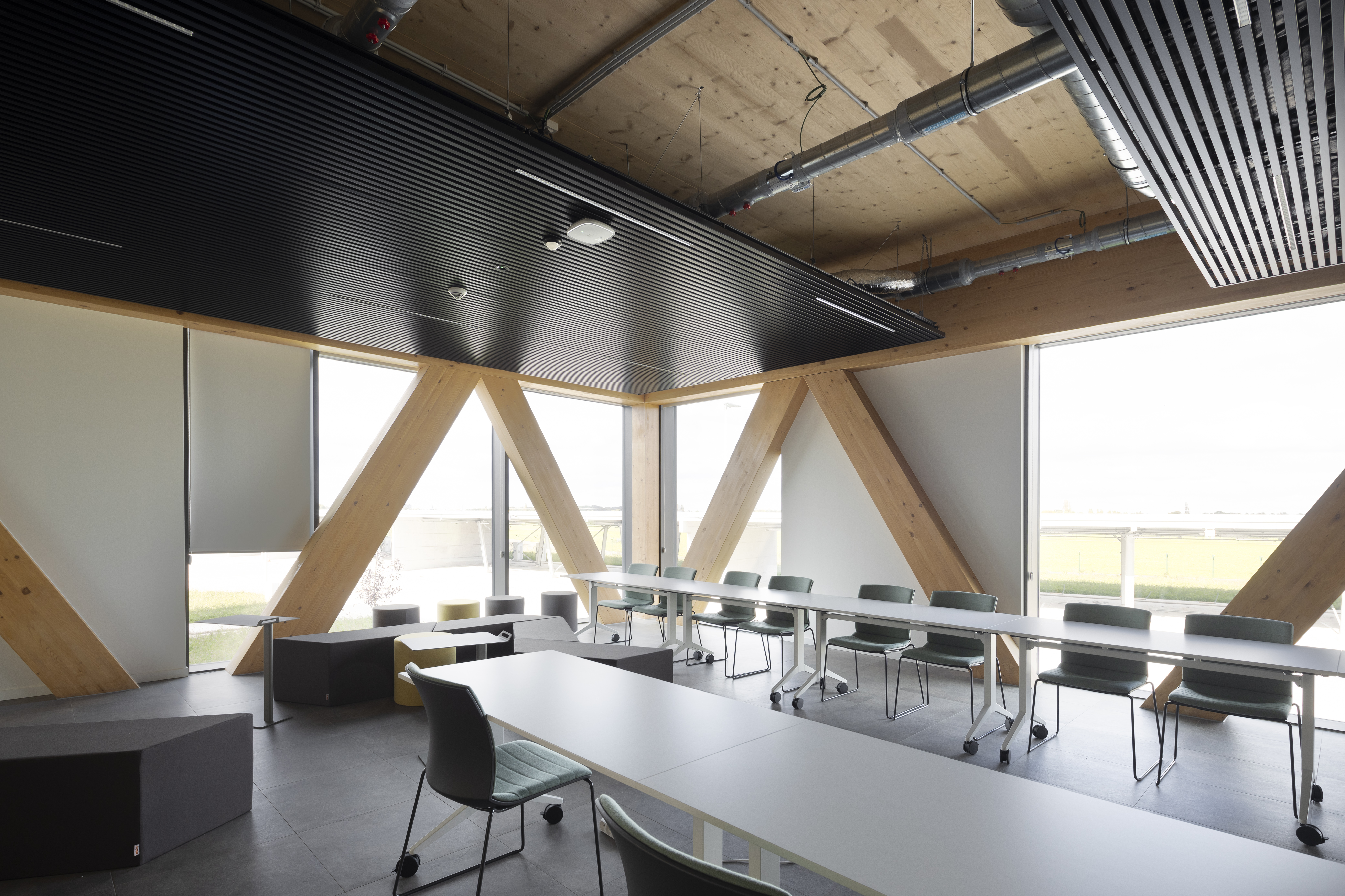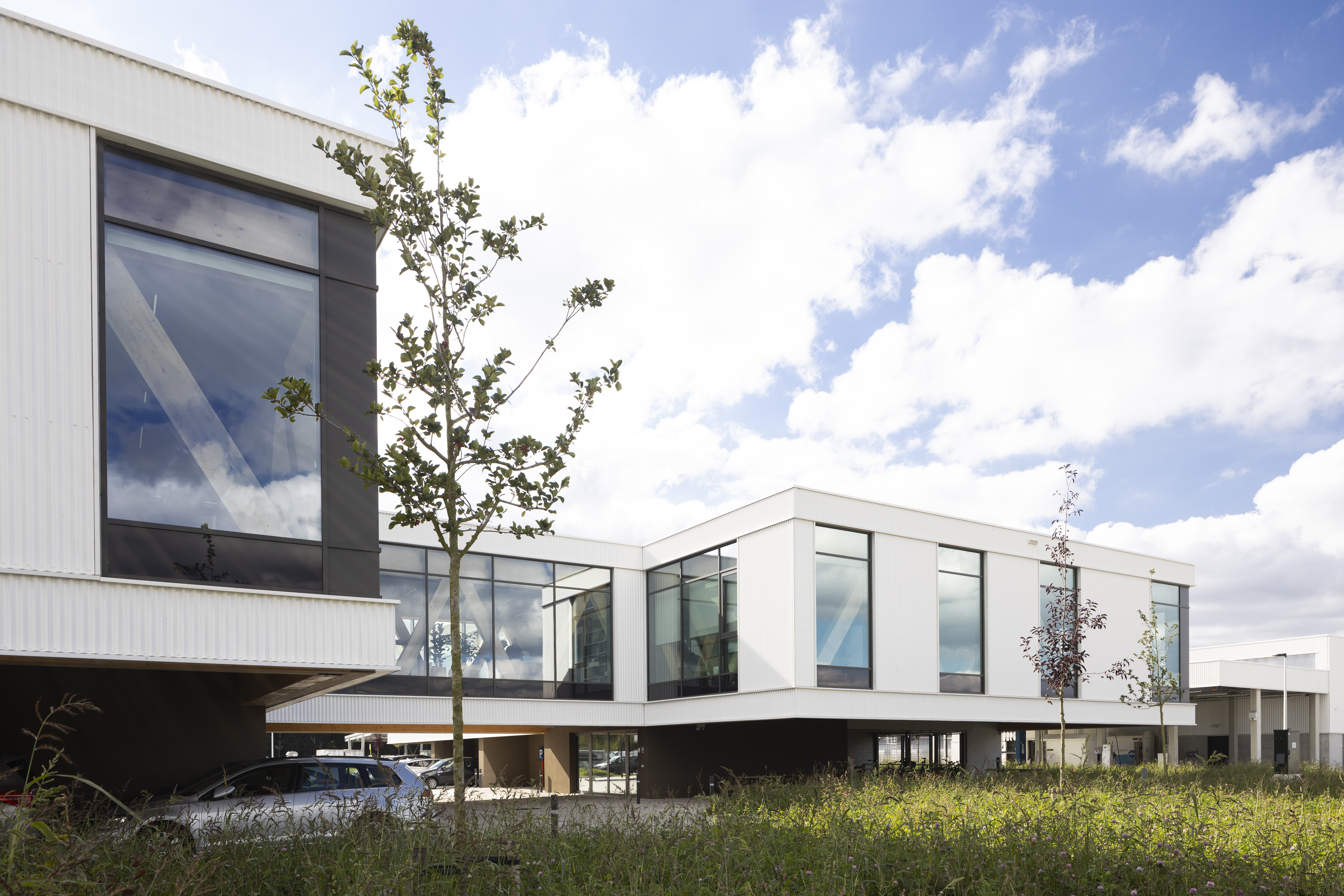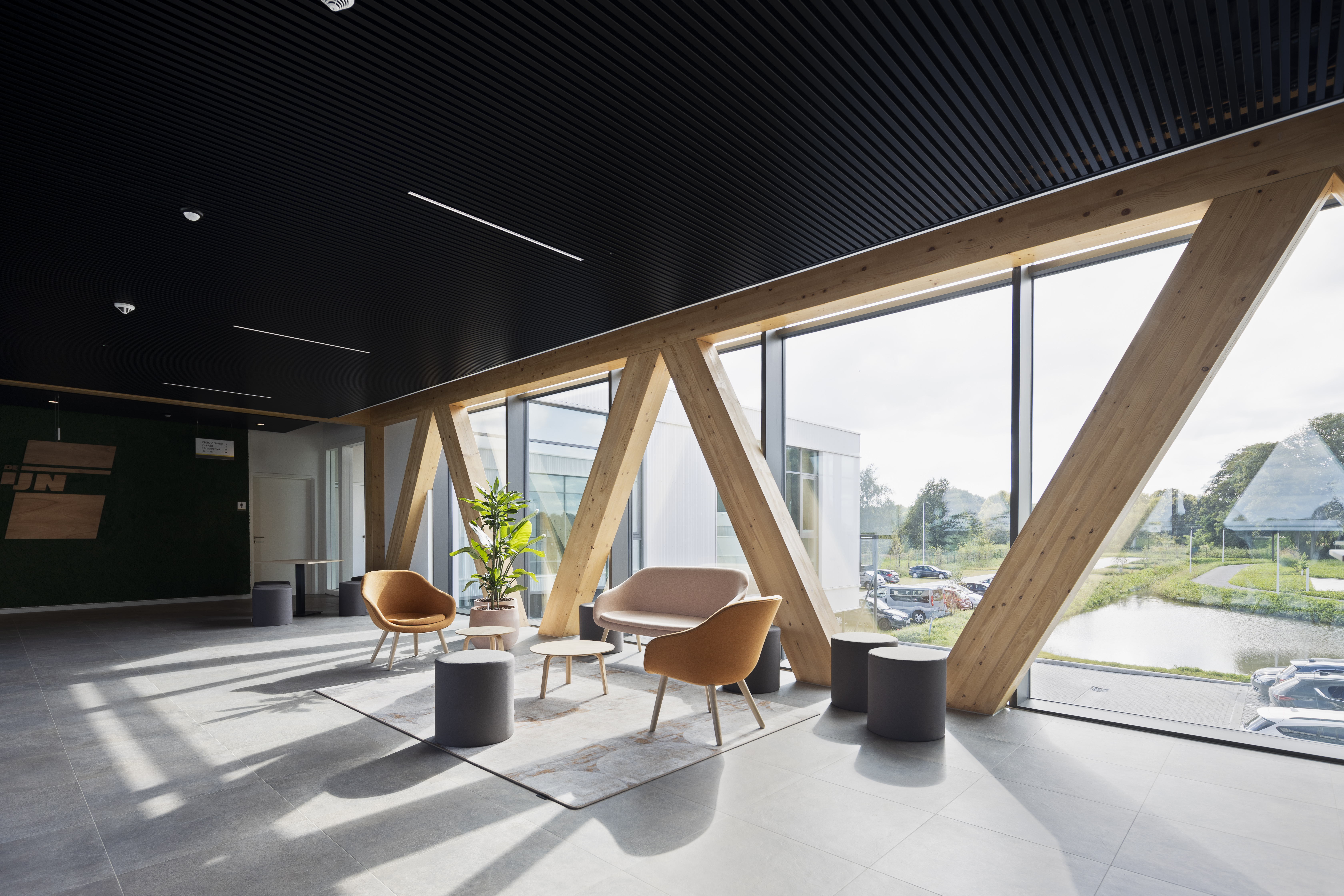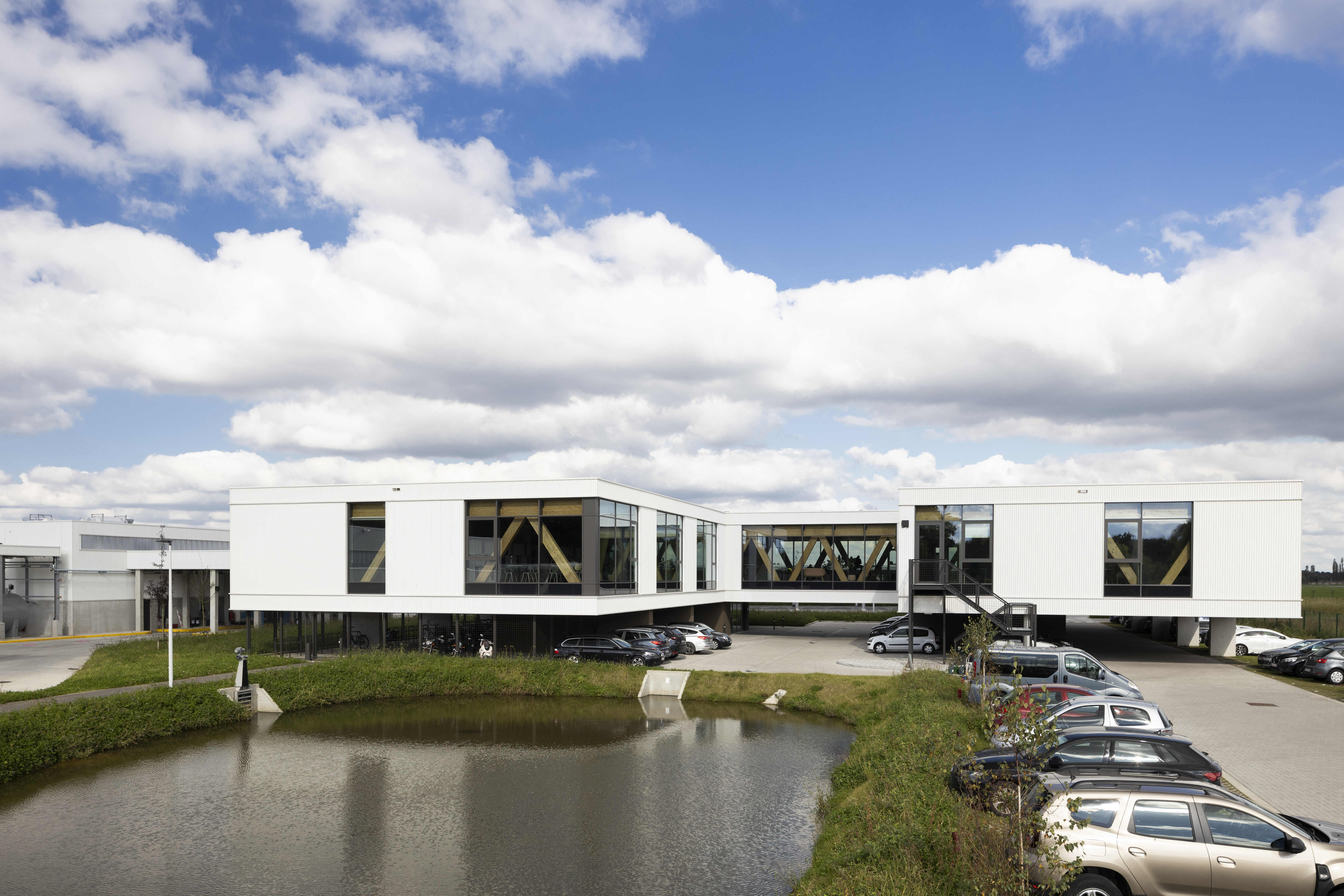 Een nieuw dienstgebouw aan de nieuwe busstelplaats van de Lijn. Dit gebouw is opgebouwd uit gelamelleerde vakwerken met telkens een overkraging van 7,5m.