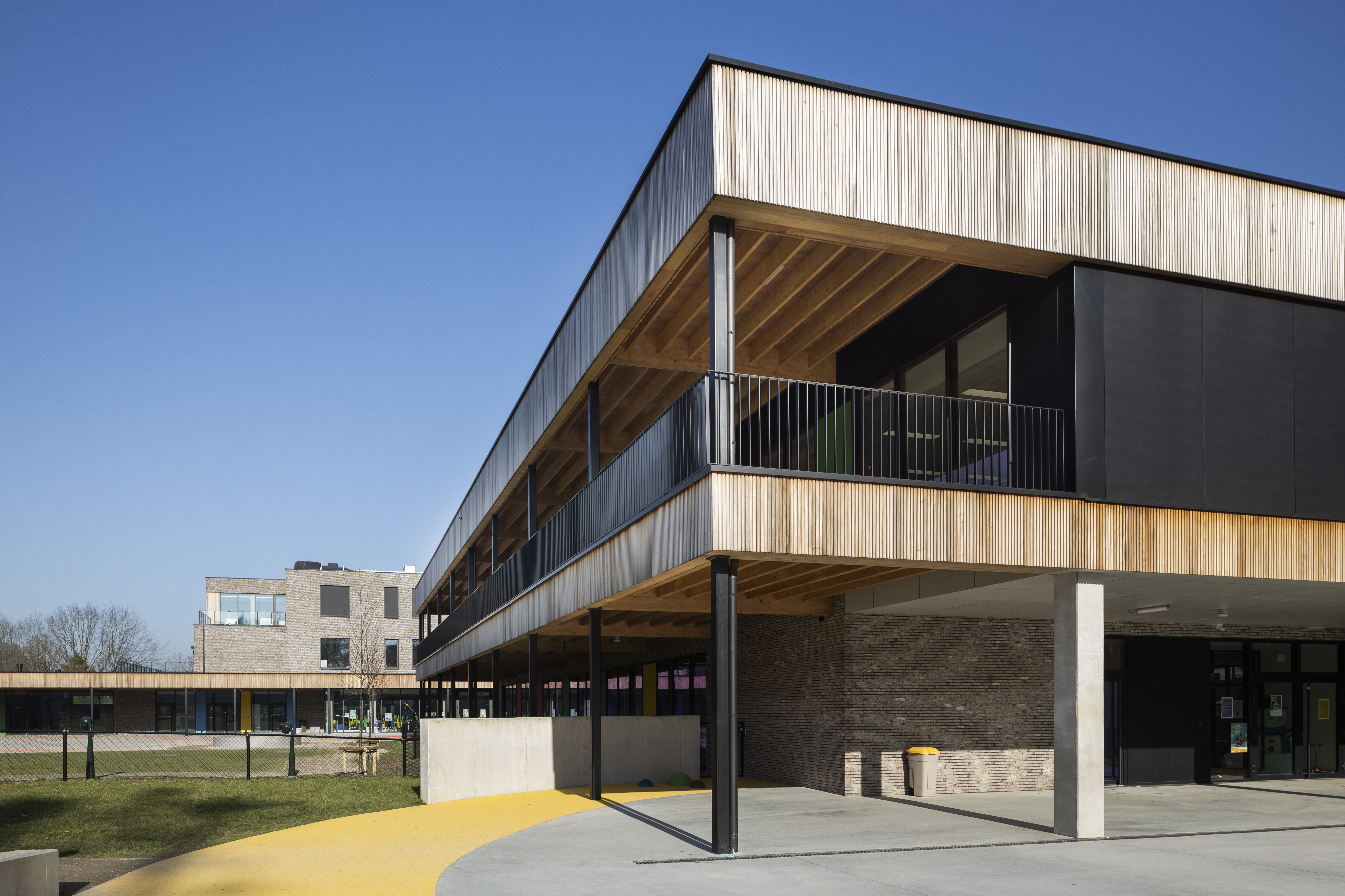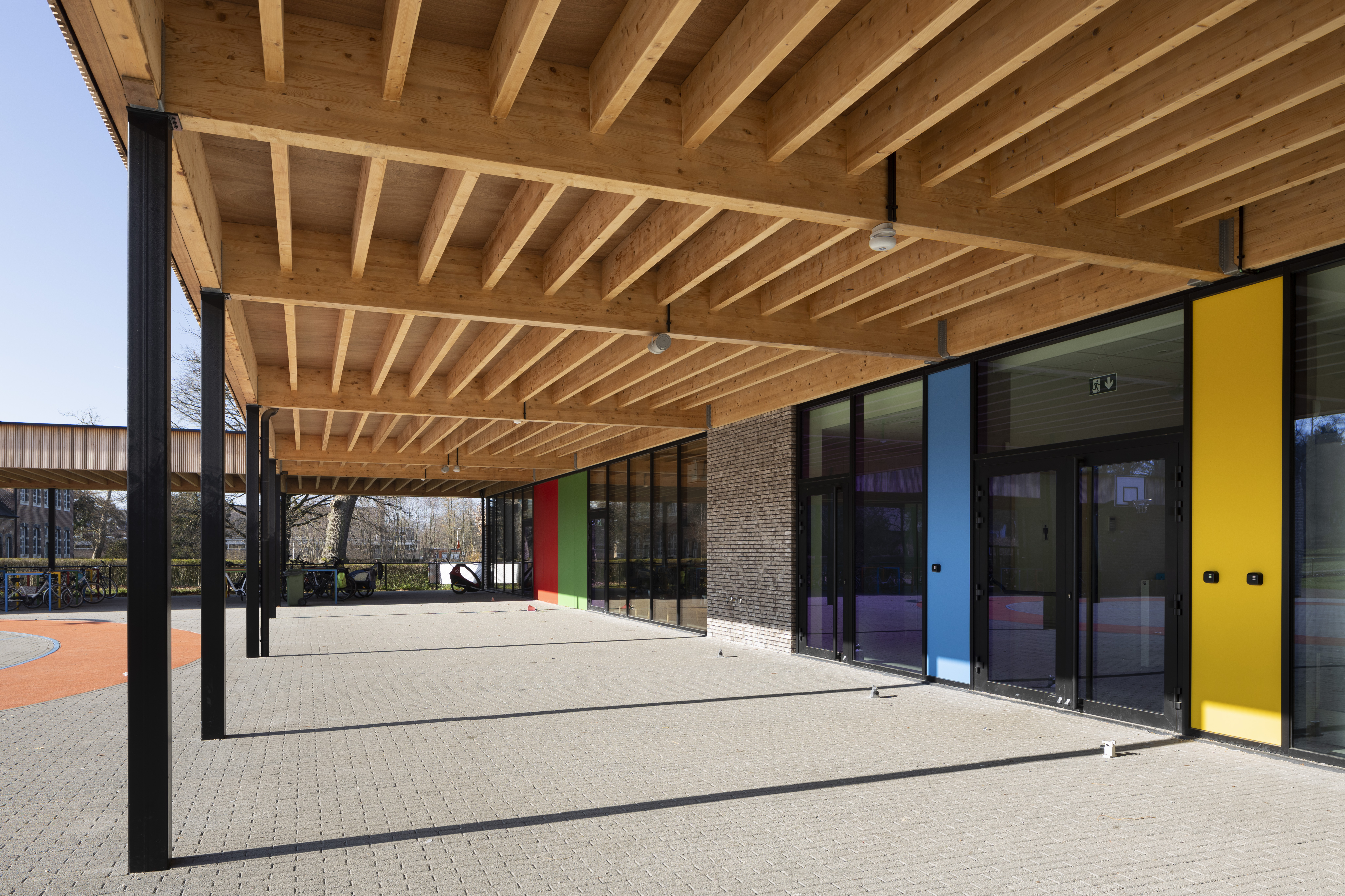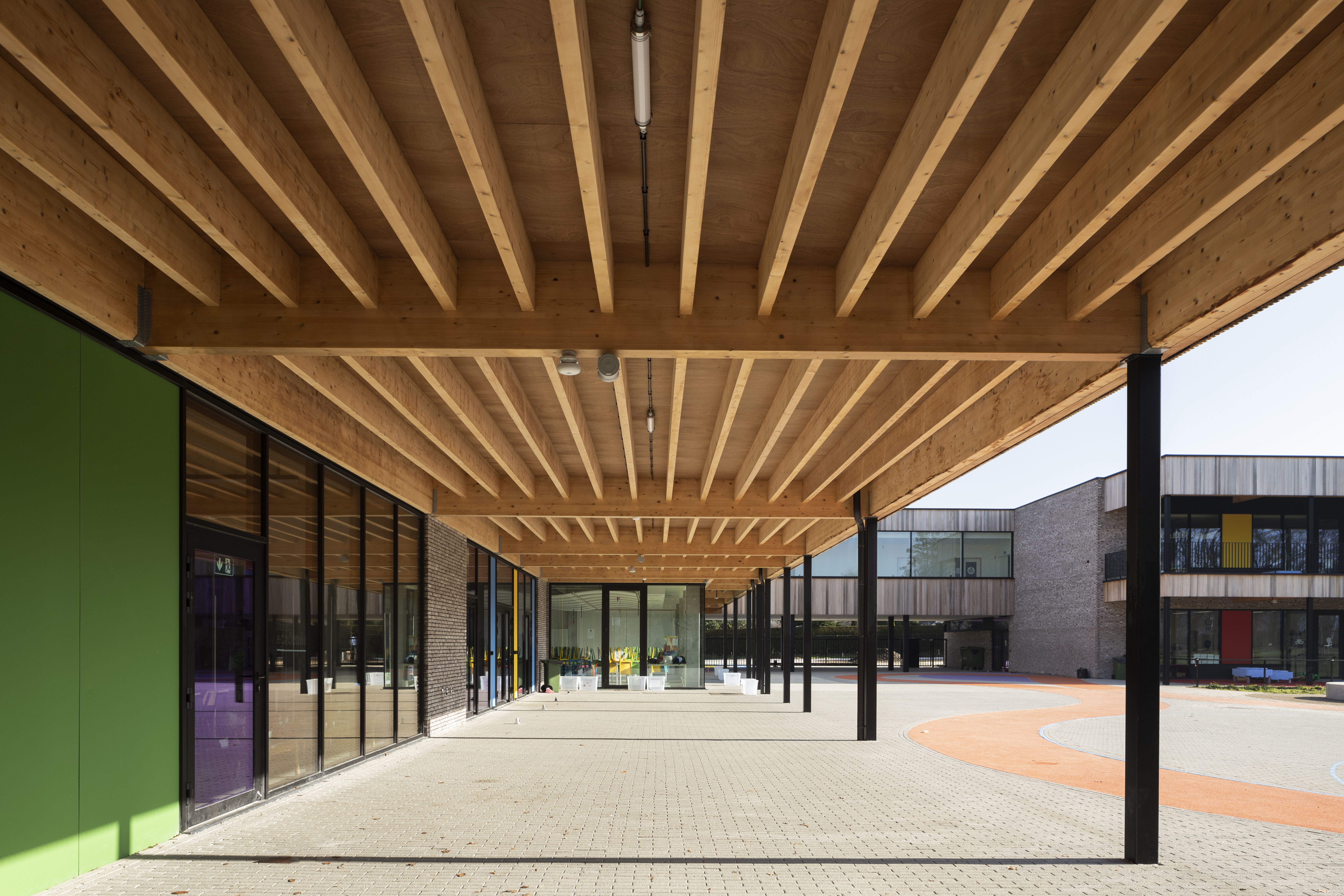Plaatsing van gelamelleerde balken voor de bouw van een roostering als overkapping aan de school.