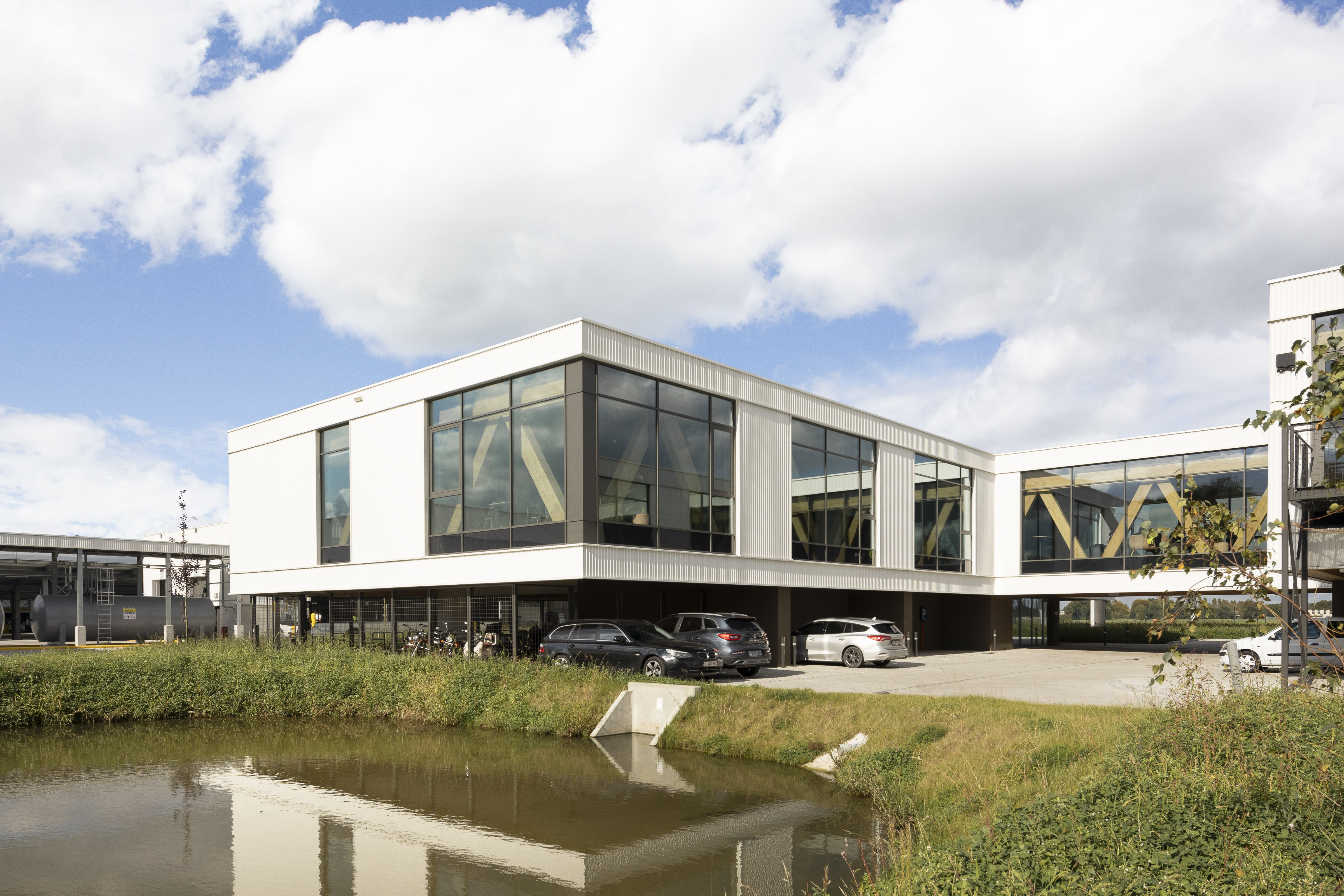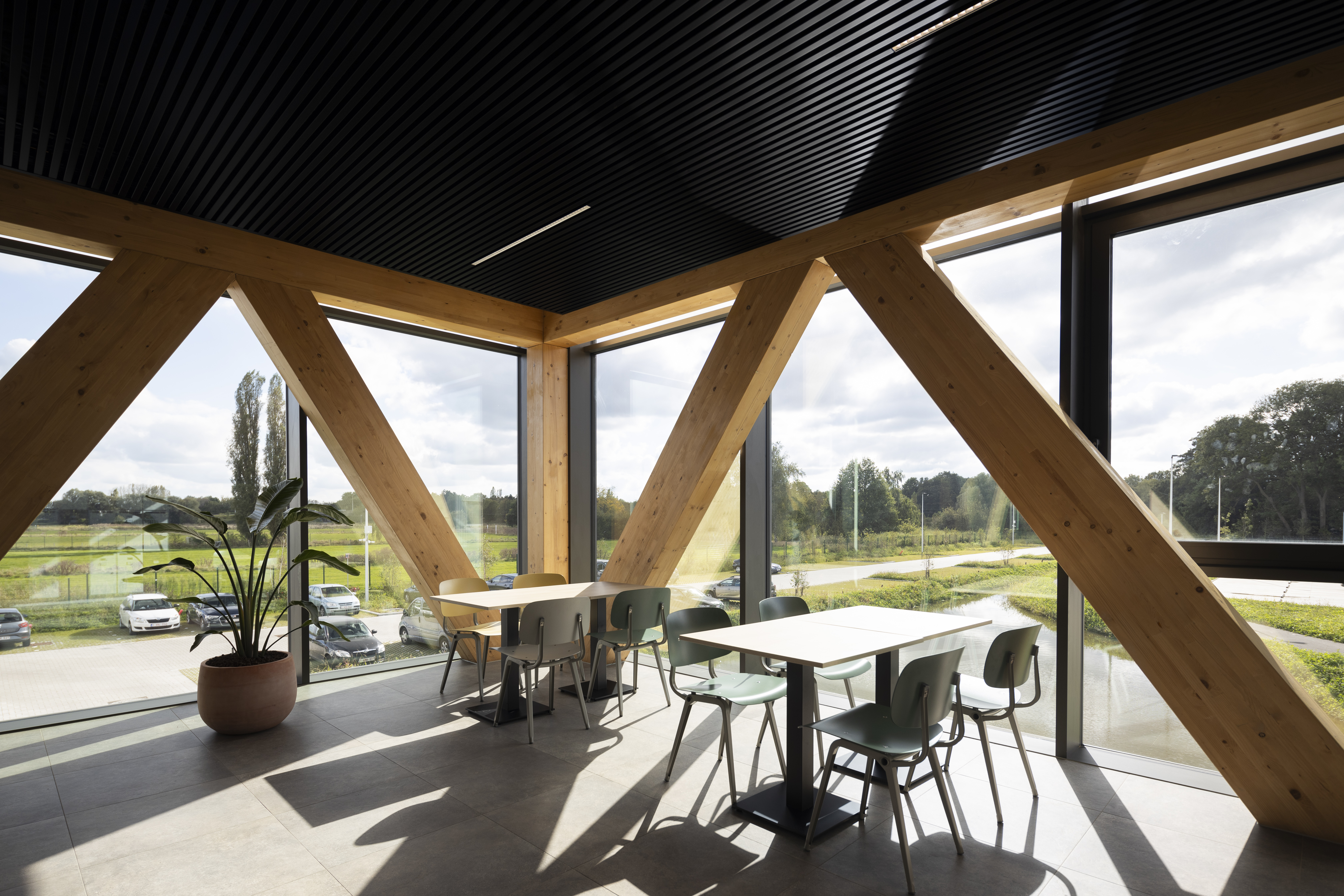 Een nieuw dienstgebouw aan de nieuwe busstelplaats van de Lijn. Dit gebouw is opgebouwd uit gelamelleerde vakwerken met telkens een overkraging van 7,5m.