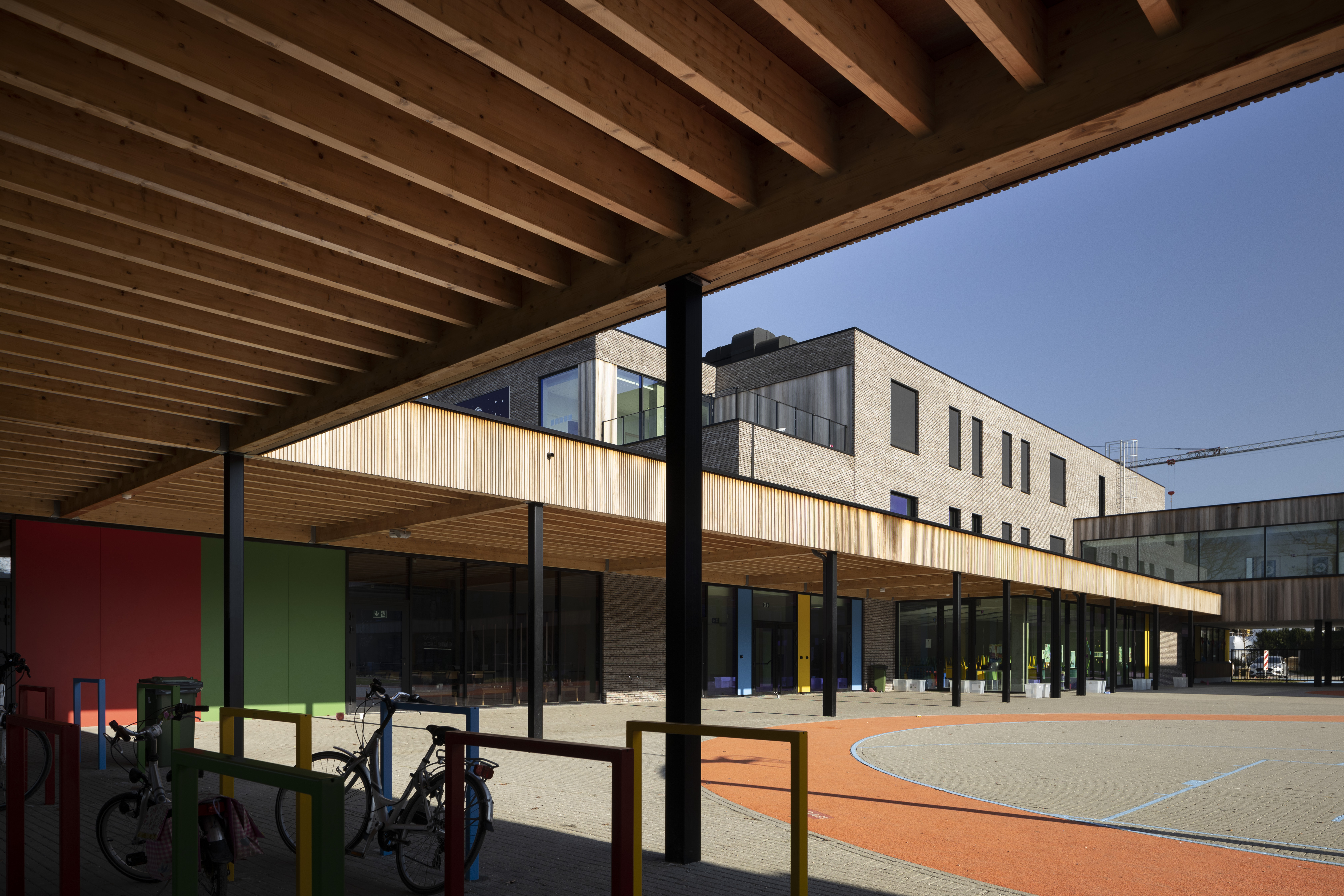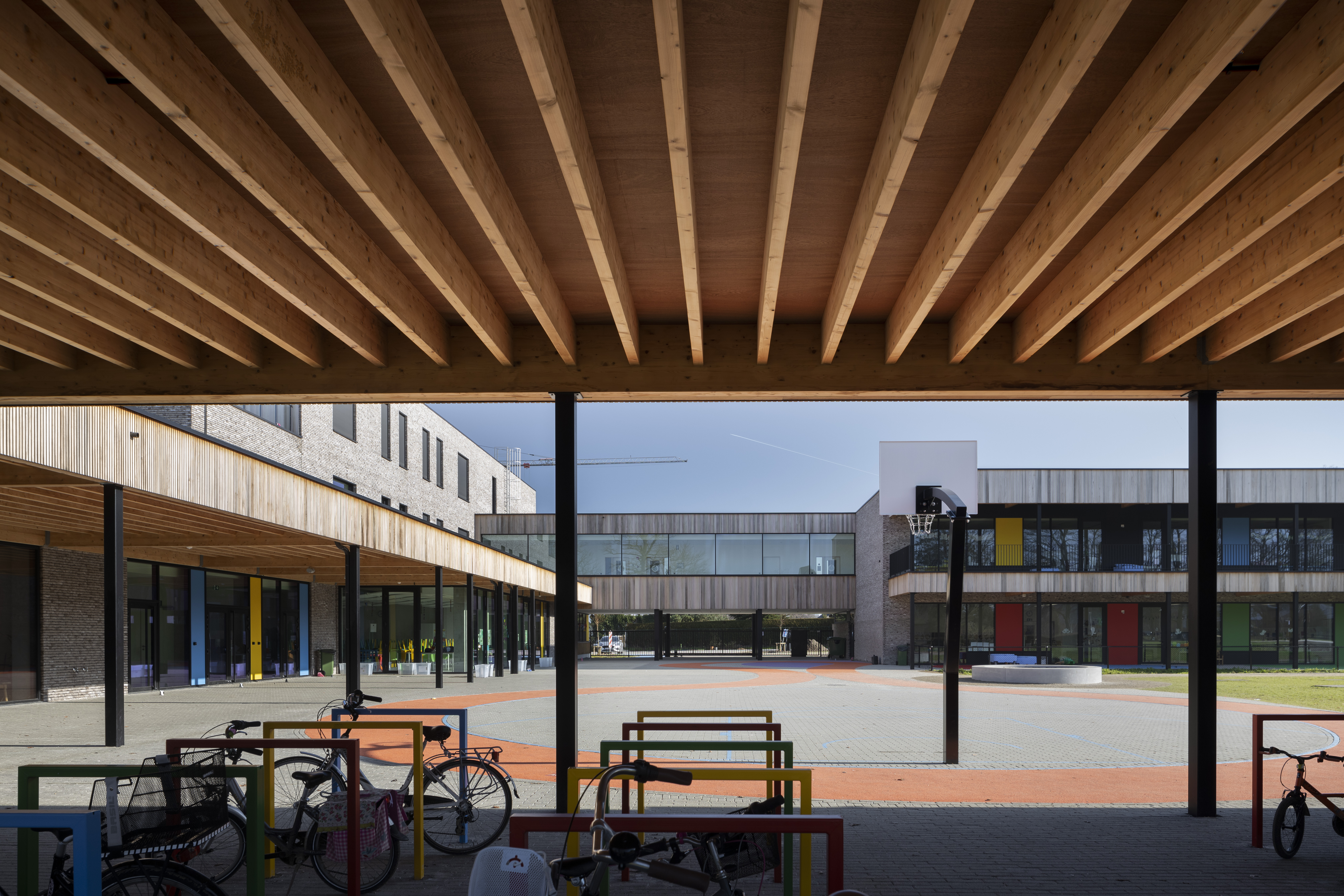 Plaatsing van gelamelleerde balken voor de bouw van een roostering als overkapping aan de school.