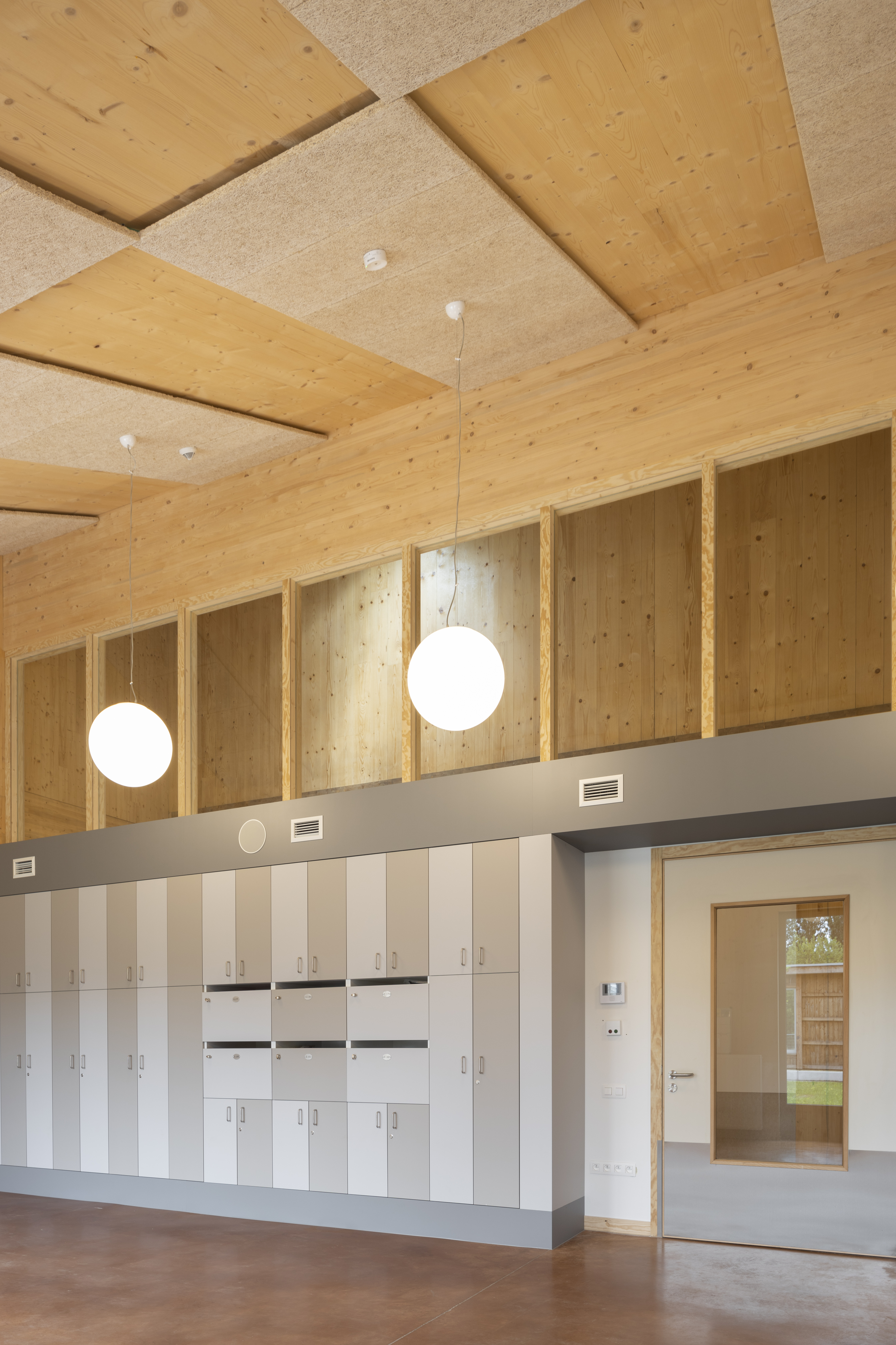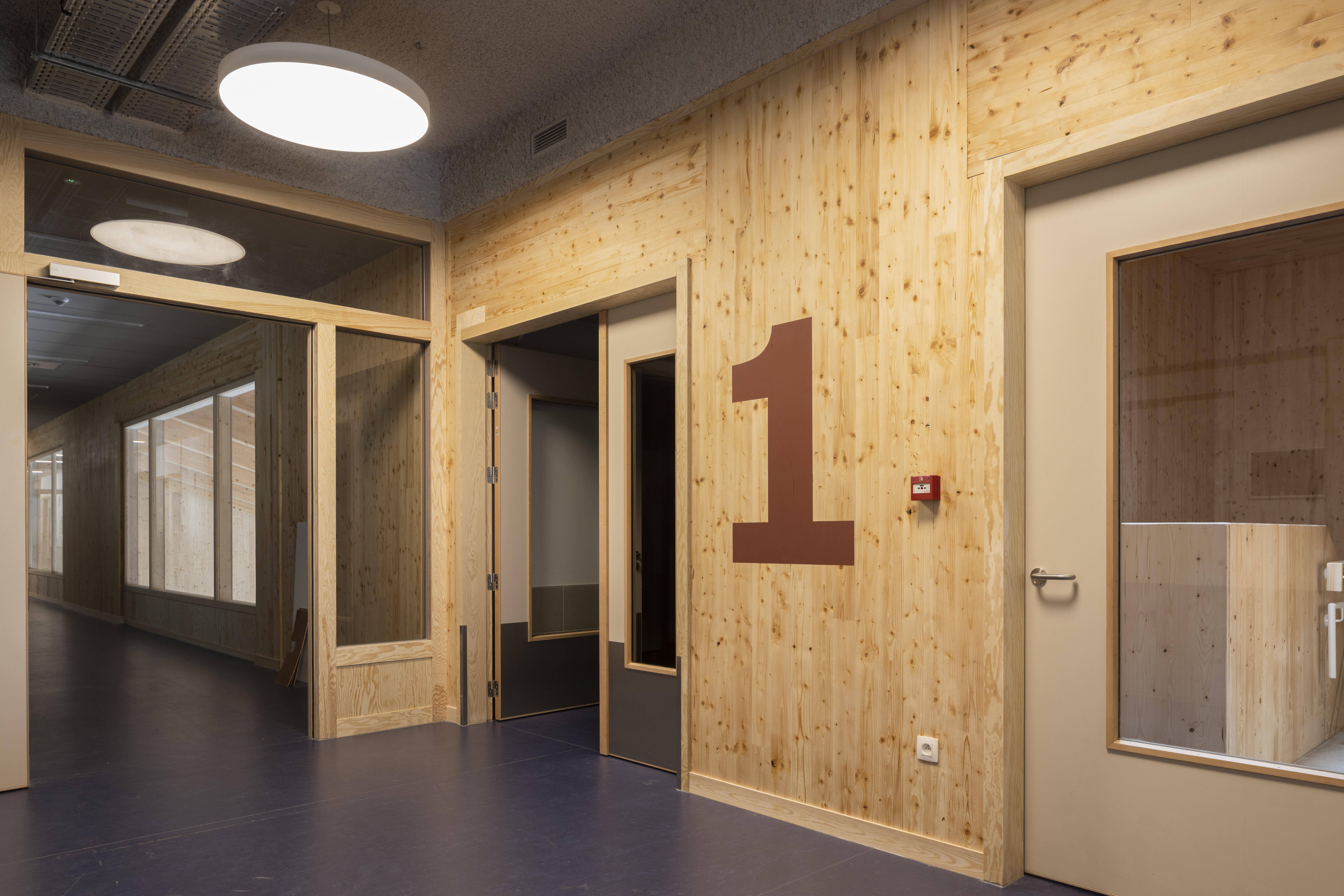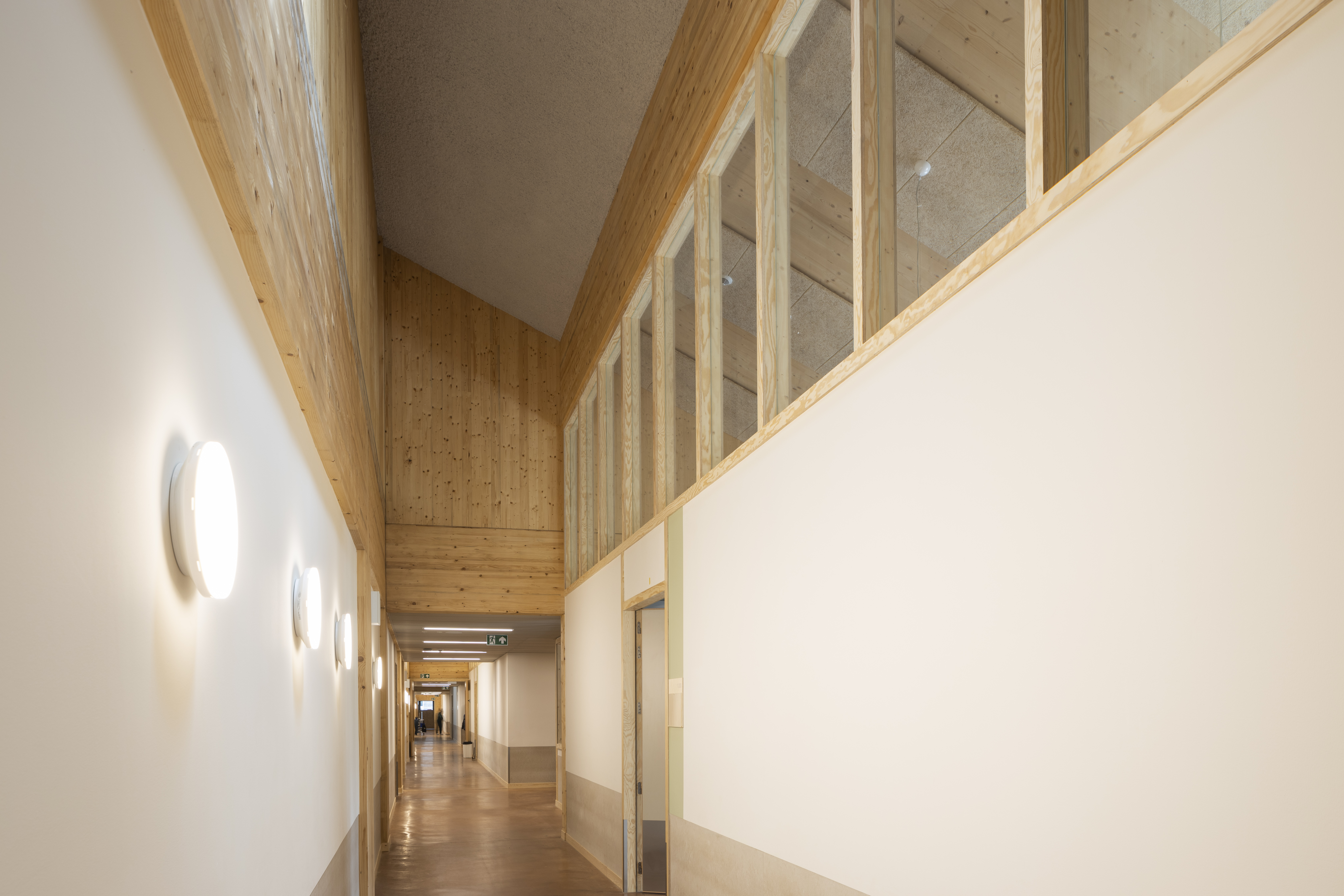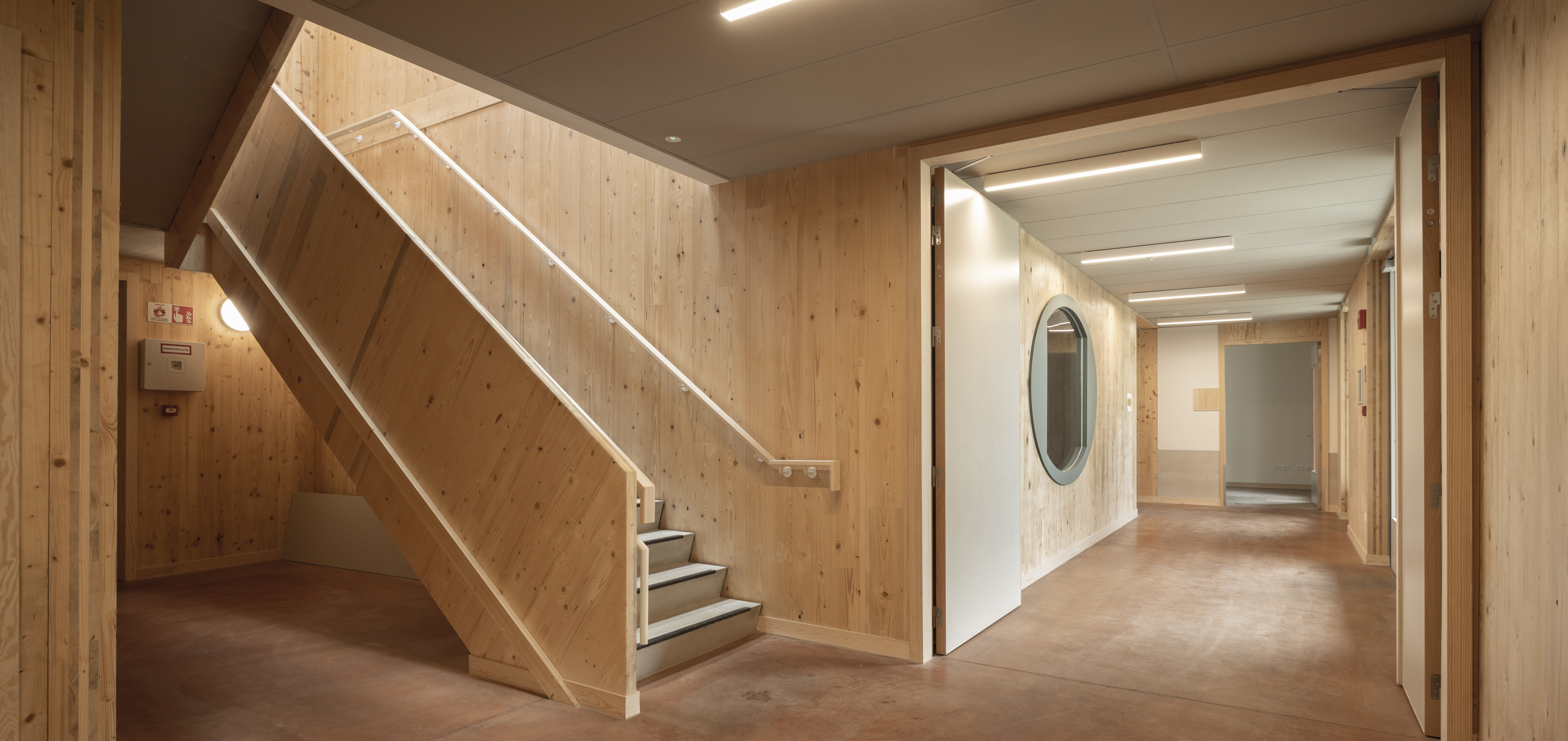Bouwheer en architect kozen bewust voor CLT als bouwmateriaal. Hout brengt rust en zorgt voor de nodige structuur met een heilzaam effect op het gedrag van de kinderen. Daarom werd ook voor de afwerking zo veel mogelijk hout voorzien. Het resultaat? Een gebouw met korte overspanningen en zichtbare houten plafonds, balken en kolommen. Door onder meer de klassenwanden niet structureel uit te voeren, behoudt het gebouw bovendien een hoge mate van flexibiliteit.