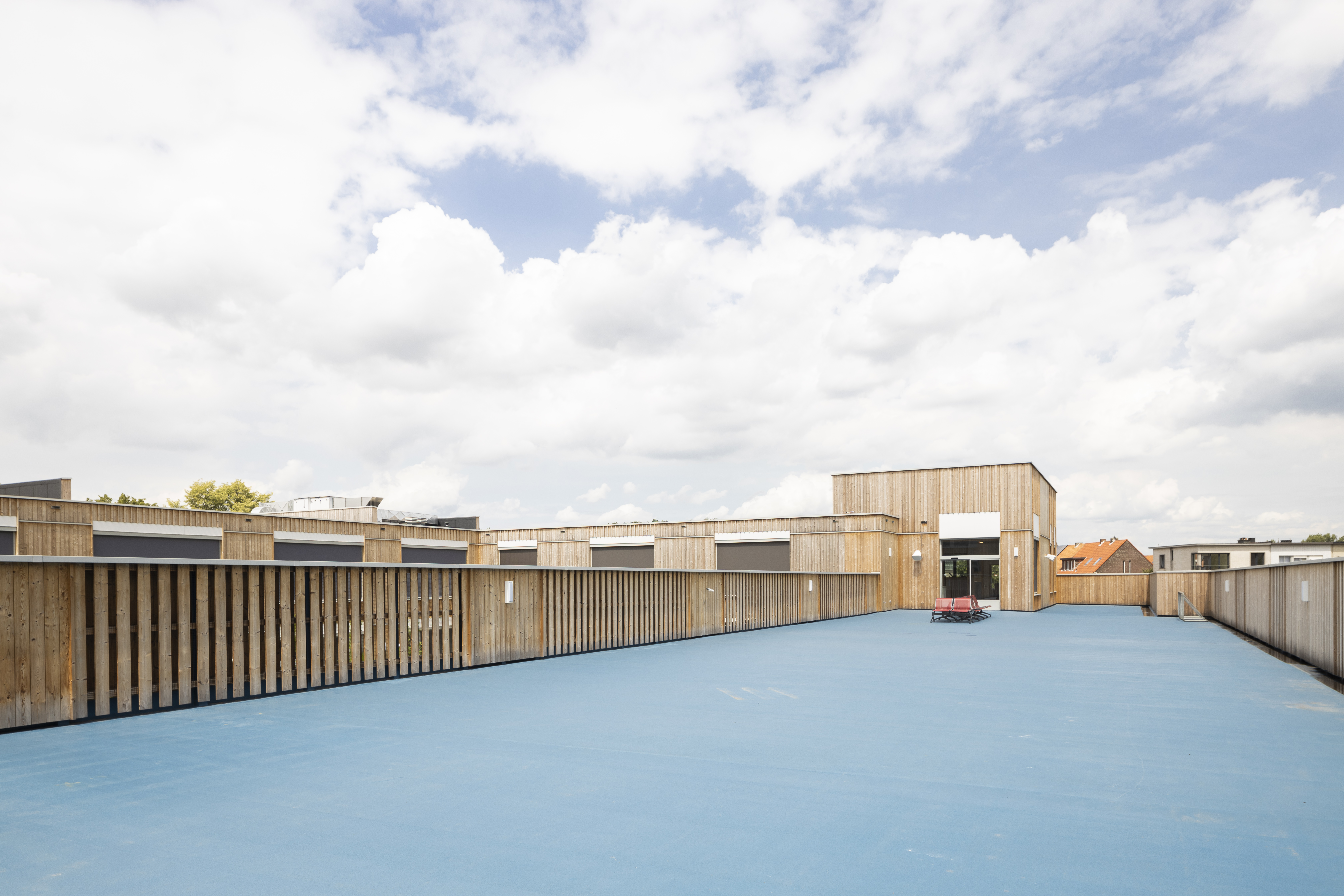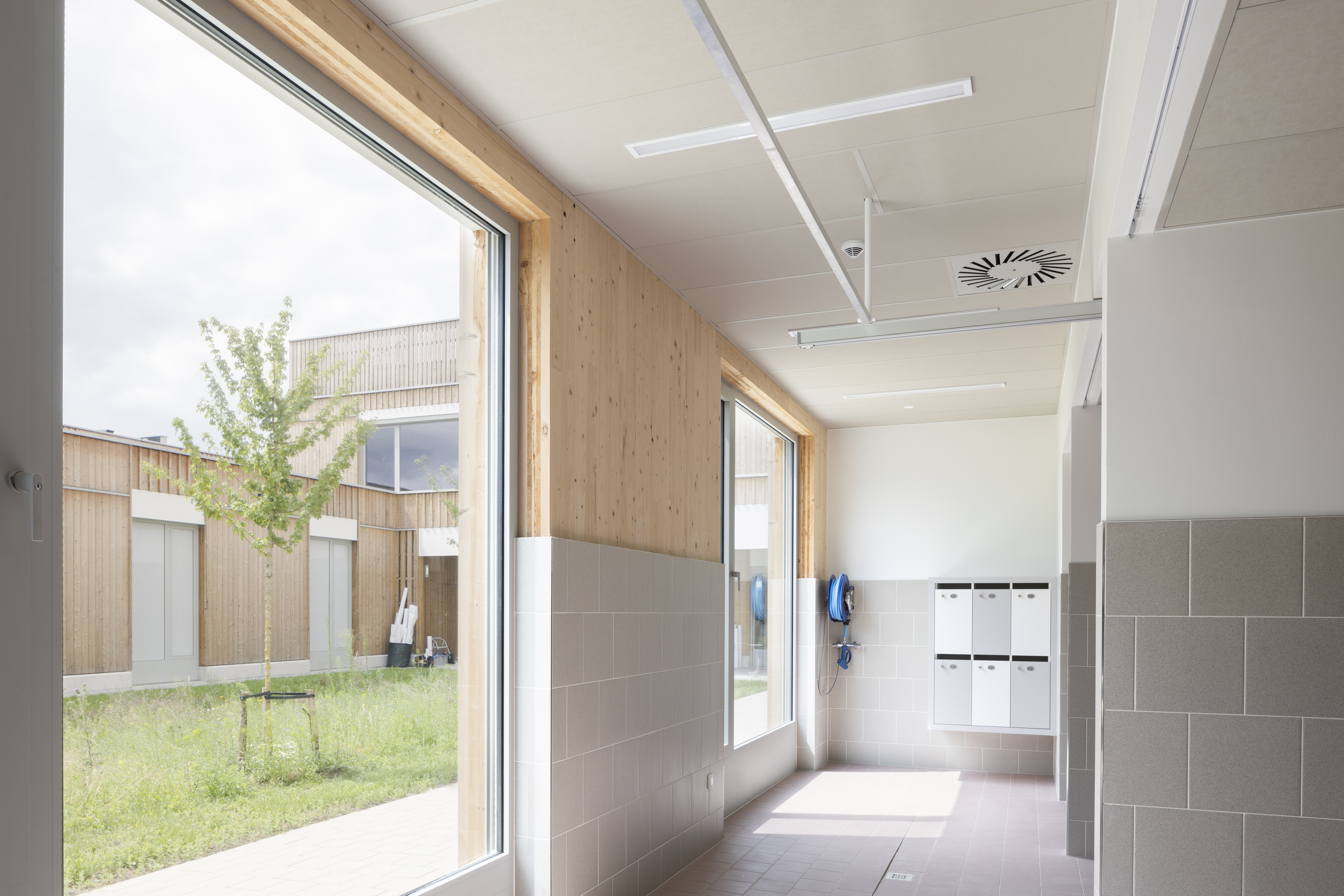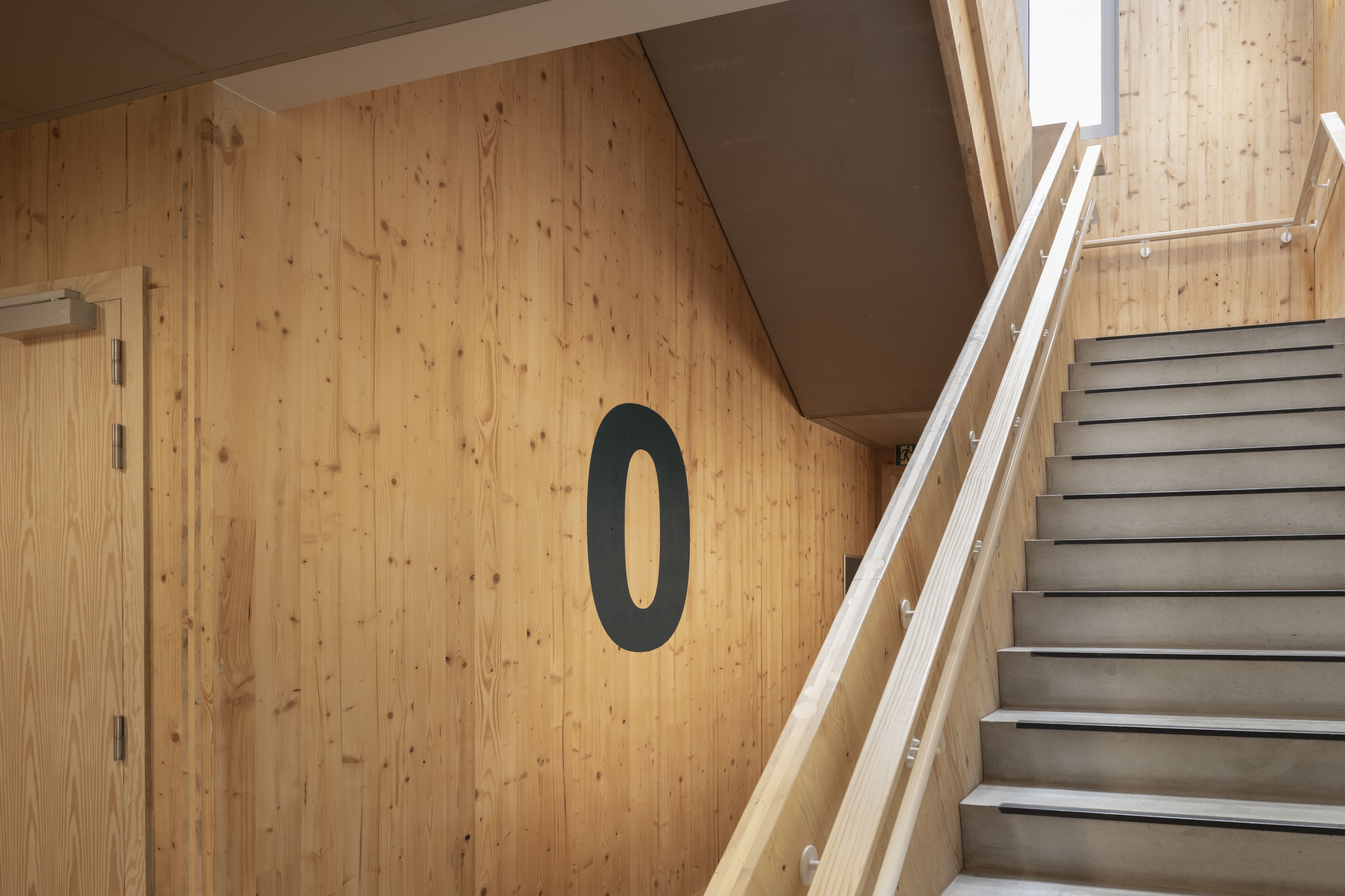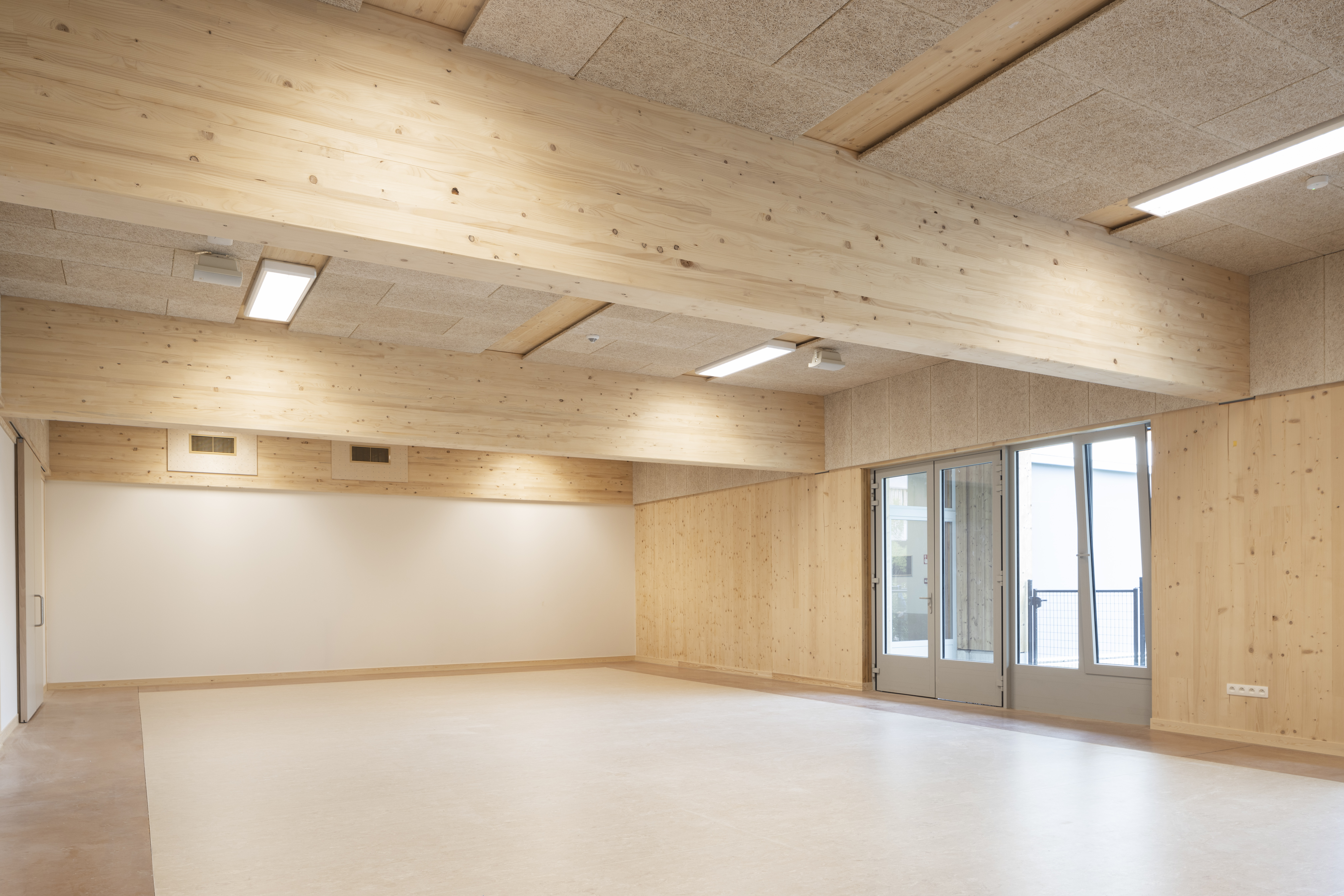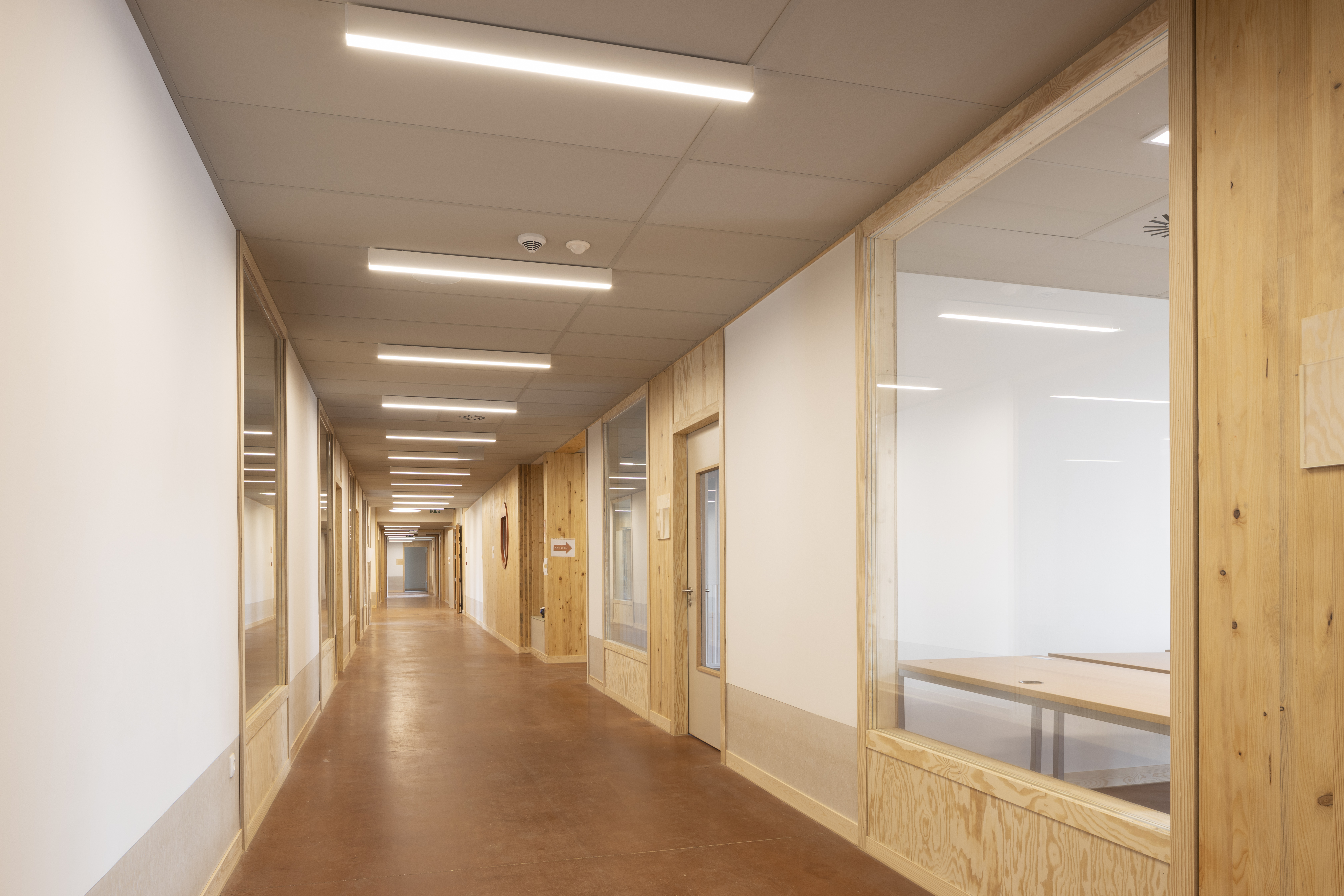 Bouwheer en architect kozen bewust voor CLT als bouwmateriaal. Hout brengt rust en zorgt voor de nodige structuur met een heilzaam effect op het gedrag van de kinderen. Daarom werd ook voor de afwerking zo veel mogelijk hout voorzien. Het resultaat? Een gebouw met korte overspanningen en zichtbare houten plafonds, balken en kolommen. Door onder meer de klassenwanden niet structureel uit te voeren, behoudt het gebouw bovendien een hoge mate van flexibiliteit.
