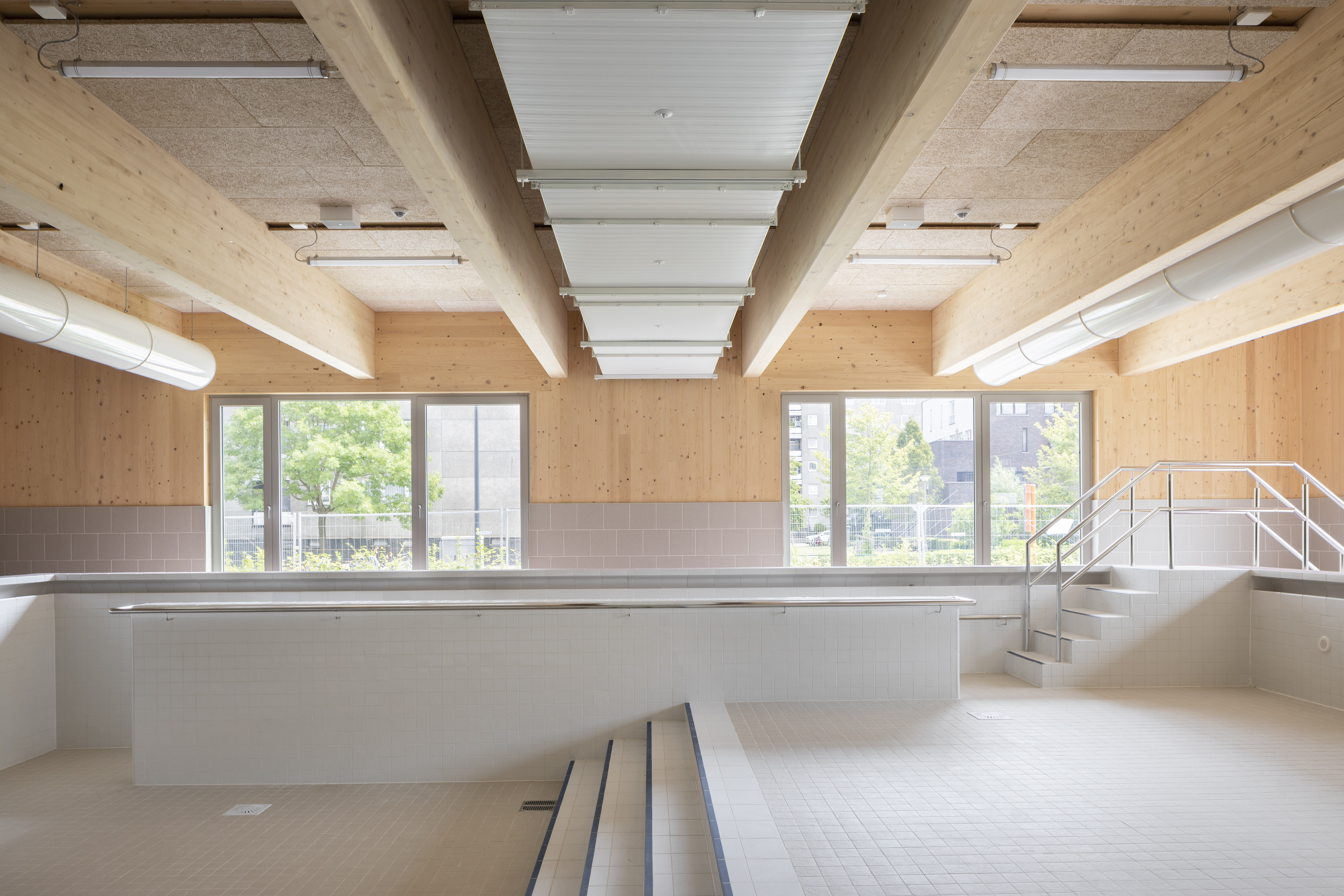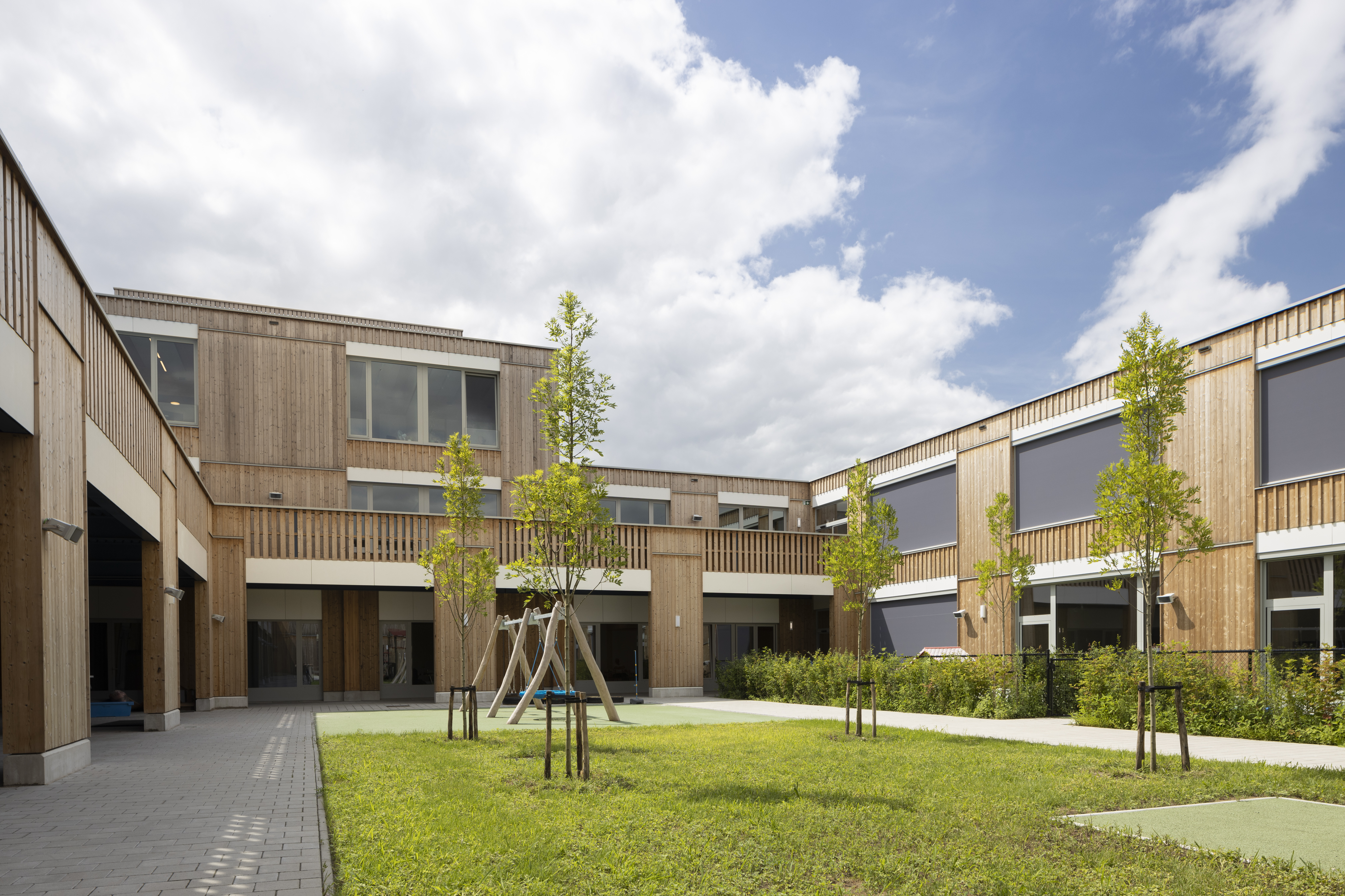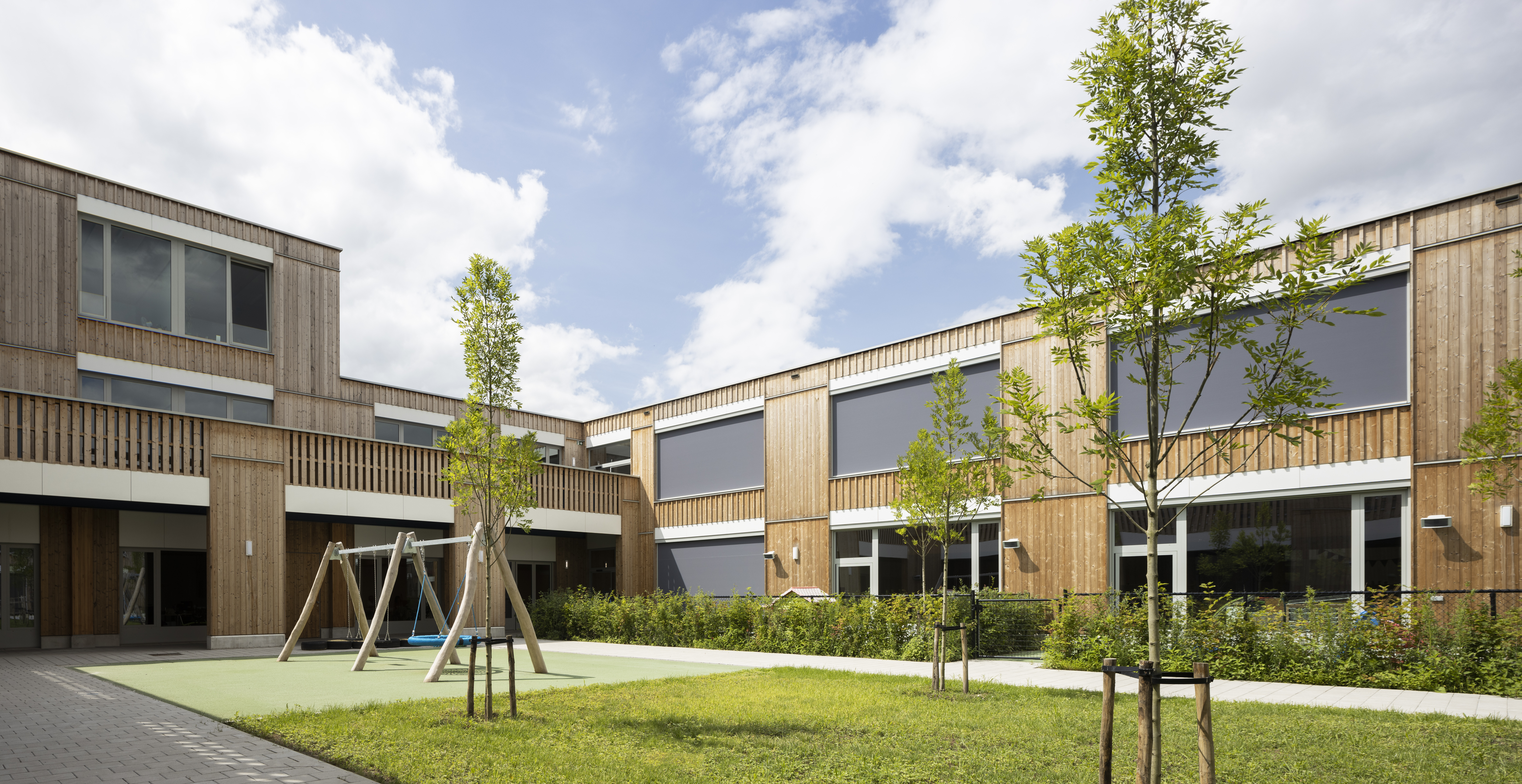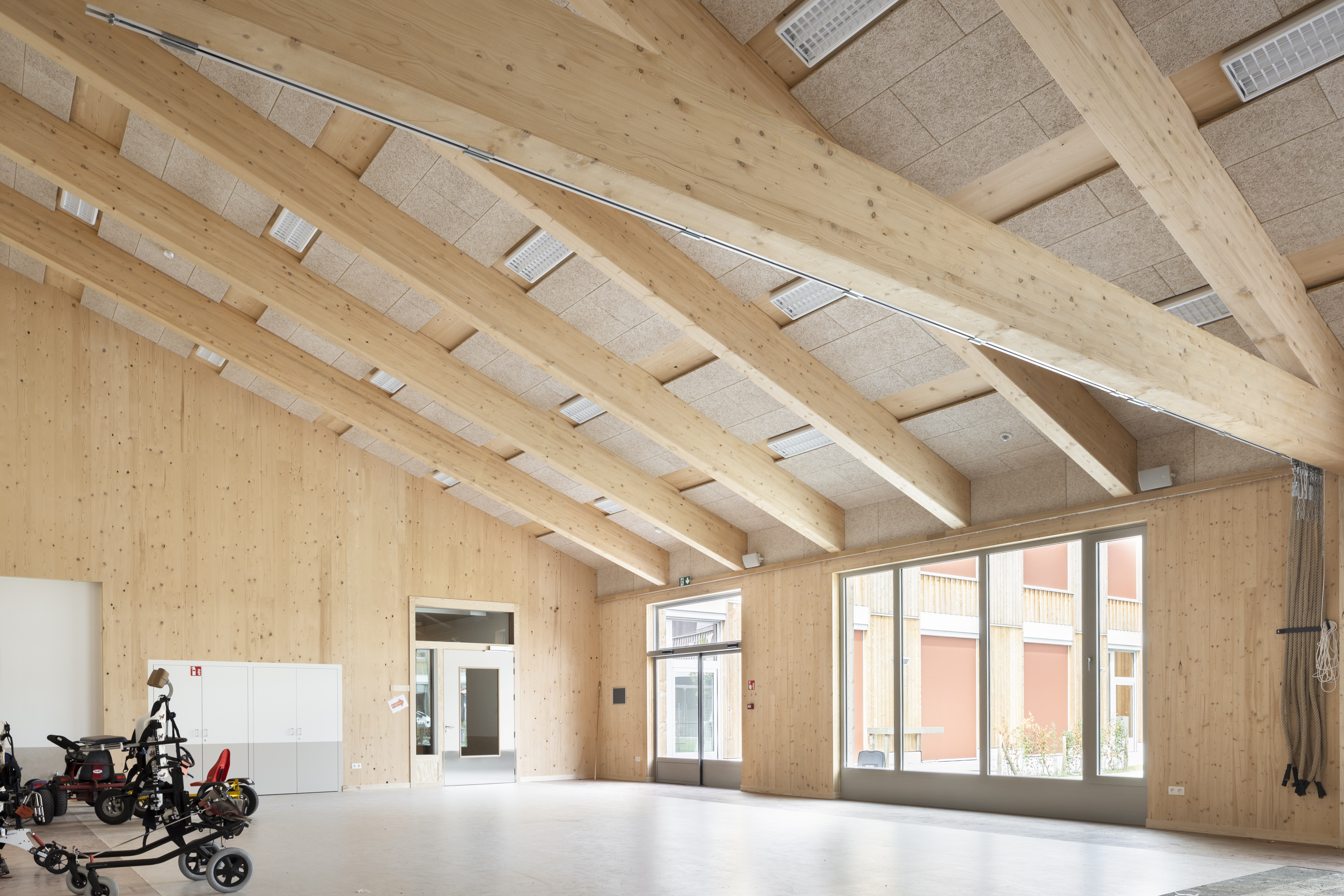 Bouwheer en architect kozen bewust voor CLT als bouwmateriaal. Hout brengt rust en zorgt voor de nodige structuur met een heilzaam effect op het gedrag van de kinderen. Daarom werd ook voor de afwerking zo veel mogelijk hout voorzien. Het resultaat? Een gebouw met korte overspanningen en zichtbare houten plafonds, balken en kolommen. Door onder meer de klassenwanden niet structureel uit te voeren, behoudt het gebouw bovendien een hoge mate van flexibiliteit.