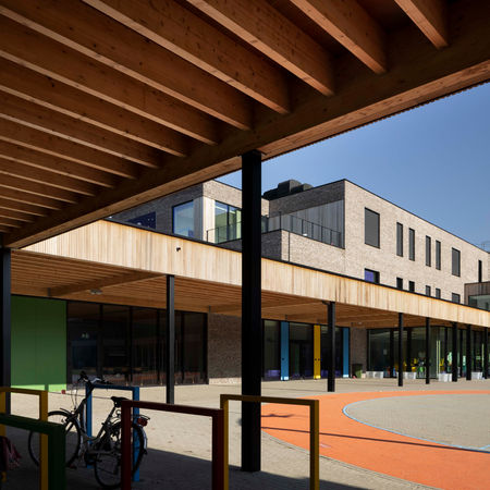 Plaatsing van gelamelleerde balken voor de bouw van een roostering als overkapping aan de school.